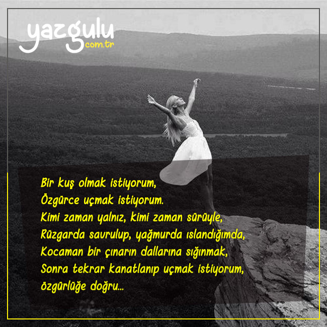 Bir kuş olmak istiyorum, Özgürce uçmak istiyorum. Kimi zaman yalnız, kimi zaman sürüyle, Rüzgarda savrulup, yağmurda ıslandığımda, Kocaman bir çınarın dallarına sığınmak, Sonra tekrar kanatlanıp uçmak istiyorum, özgürlüğe doğru…