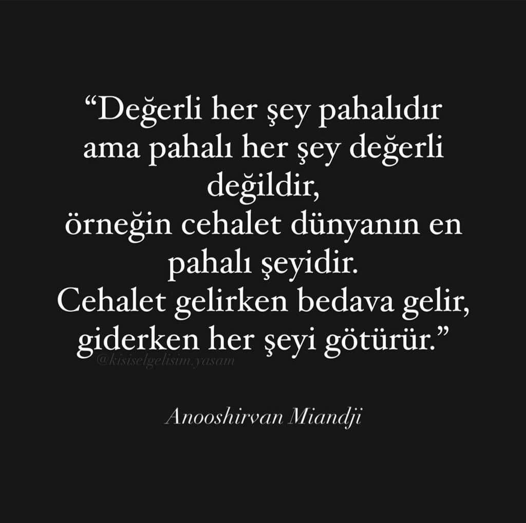 Değerli her şey pahalıdır ama pahalı her şey değerli değildir, örneğin cehalet dünyanın en pahalı şeyidir. Cehalet gelirken bedava gelir, giderken her şeyi götürür. Anooshirvan Miandji