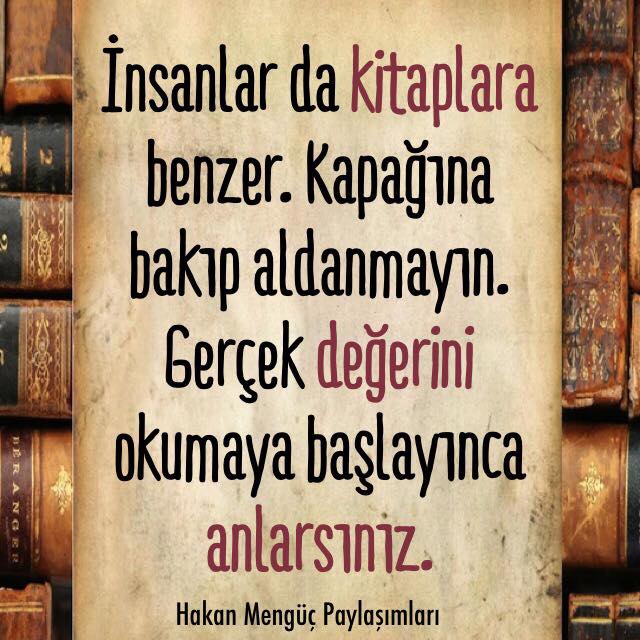 İnsanlar da kitaplar gibidir.. Kapağına bakıp aldanmayın. Gerçek değerini okumaya başlayınca anlarsın. Hakan Mengüç. Hiçbir Karşılaşma Tesadüf Değildir, Hakan Mengüç.