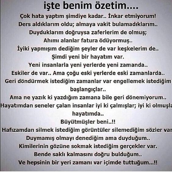 İŞTE BENİM ÖZETİM Çok hata yaptım şimdiye kadar, İnkar etmiyorum. Ders aldıklarım oldu, almaya vakit bulamadıklarım.. Duyduklarım doğruysa zaferlerim de olmuş, Ahımı alanlar şimdi fatura ödüyormuş. İyi ki yapmışım dediğim şeyler de var