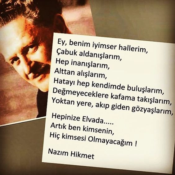 Ne fırtınalar koptu Benim hayat dallarımda Hiç birinde vazgeçmedim umutlarımdan İçimde kıyametler kopsa da Ben baharıyım yarınlarımın Çiçek açarım her kışın ardından Nazım Hikmet