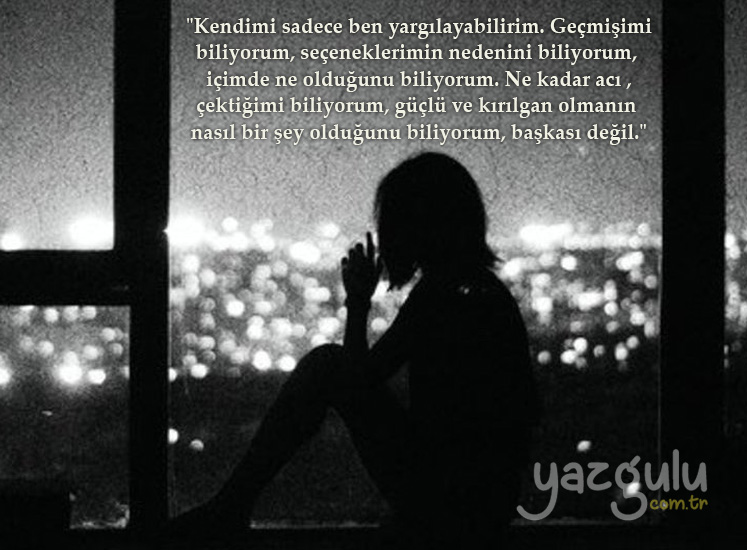 "Kendimi sadece ben yargılayabilirim. Geçmişimi biliyorum, seçeneklerimin nedenini biliyorum, içimde ne olduğunu biliyorum. Ne kadar acı çektiğimi biliyorum, güçlü ve kırılgan olmanın nasıl bir şey olduğunu biliyorum, başkası değil." - Oscar Wilde.