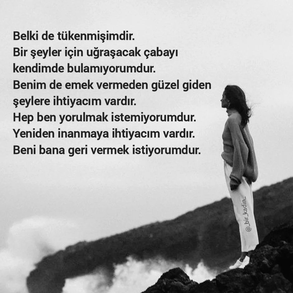 "Belki de tükenmişimdir Bir şeyler yapacak bir şeyler için uğraşacak çabayı kendimde bulamıyorumdur. Benim de emek vermeden güzel giden şeylere ihtiyacım vardır. Beni bana geri vermek istiyorumdur.."