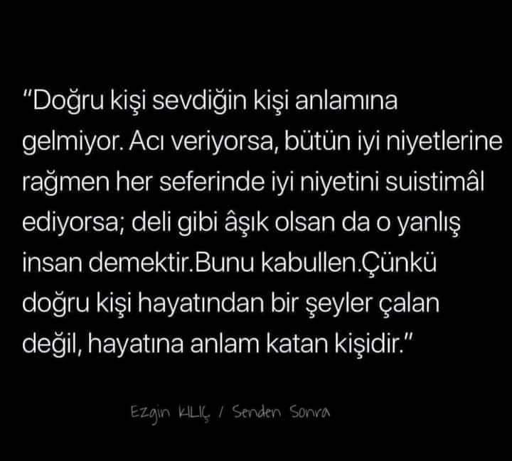 Doğru kişi sevdiğin kişi anlamına gelmiyor. çok seviyor olman da onu doğru kişi yapmaz. Sana acı veriyorsa, bütün iyi niyetlerine rağmen her seferinde iyi niyetini suistimal ediyorsa; deli gibi aşık olsan bile o