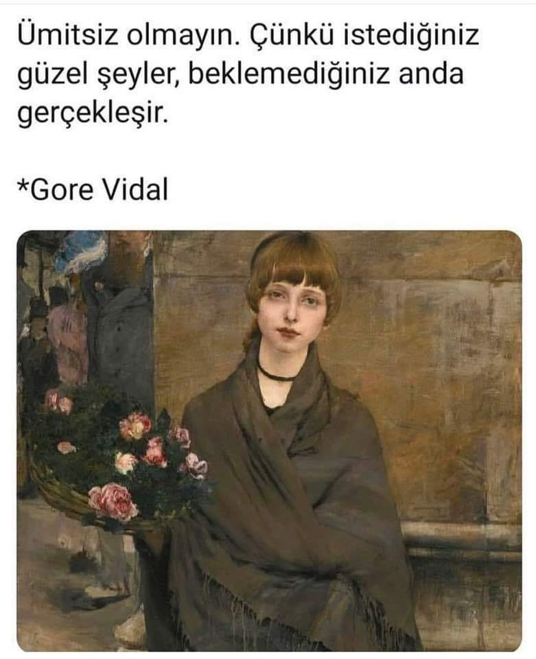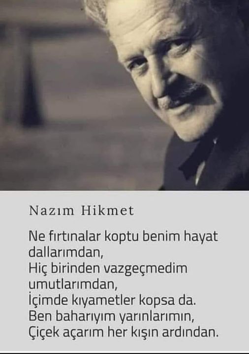 Ne fırtınalar koptu Benim hayat dallarımda Hiç birinde vazgeçmedim umutlarımdan İçimde kıyametler kopsa da Ben baharıyım yarınlarımın Çiçek açarım her kışın ardından Nazım Hikmet