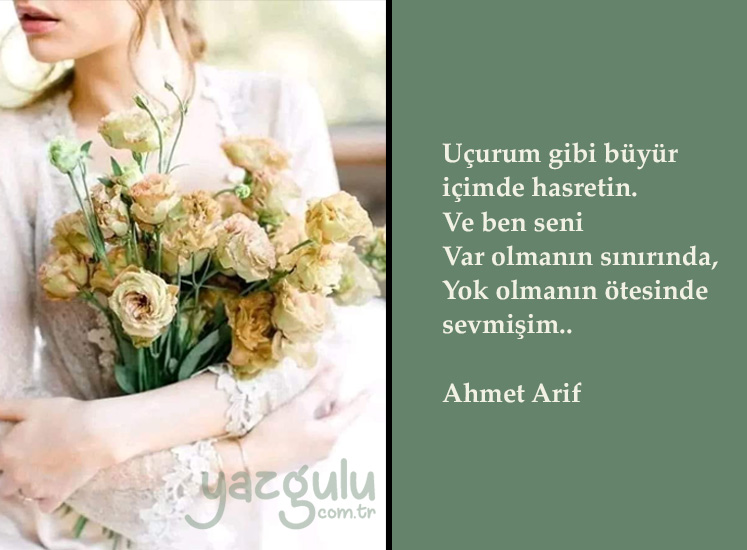 Uçurum gibi büyür içimde hasretin. Ve ben seni Var olmanın sınırında, Yok olmanın ötesinde sevmişim.. Ahmet Arif