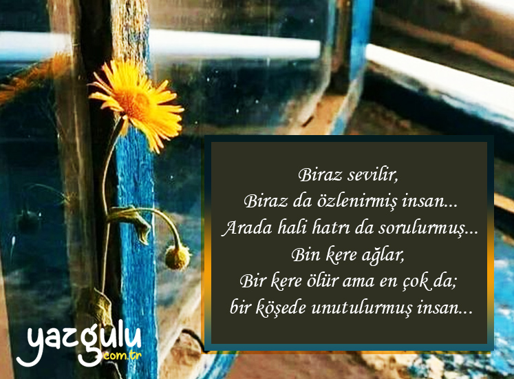 Biraz sevilir, Biraz da özlenirmiş insan... Arada hali hatrı da sorulurmuş... Bin kere ağlar, Bir kere ölür ama en çok da; bir köşede unutulurmuş insan...