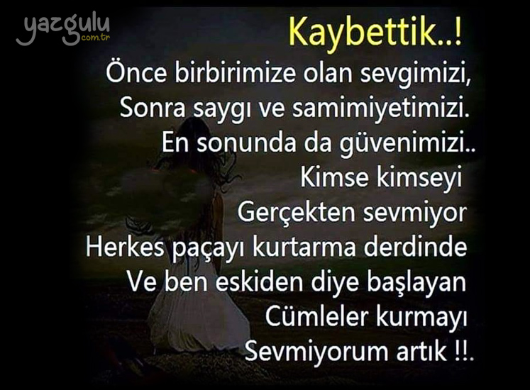 Önce Birbirimize Olan Sevgimizi, Sonra Saygı ve Samimiyetimizi. En Sonunda da Güvenimizi... Kimse Kimseyi Gerçekten Sevmiyor... Herkes Paçayı Kurtarma Derdinde Ve Ben Eskiden Diye Başlayan Cümleleri Kurmayı Sevmiyorum Artık......! Ve bizde artık yalnızlığımızı
