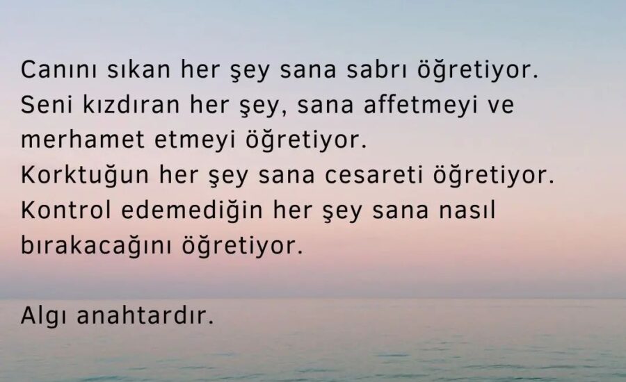 Canını sıkan her şey sana sabrı öğretiyor. Seni kızdıran her şey, sana affetmeyi ve Merhamet etmeyi öğretiyor. Korktuğun her şey sana cesareti öğretiyor. Konrol edemediğin her şey sana nasıl bırakacağını öğretiyor. ALGI ANAHTARDIR
