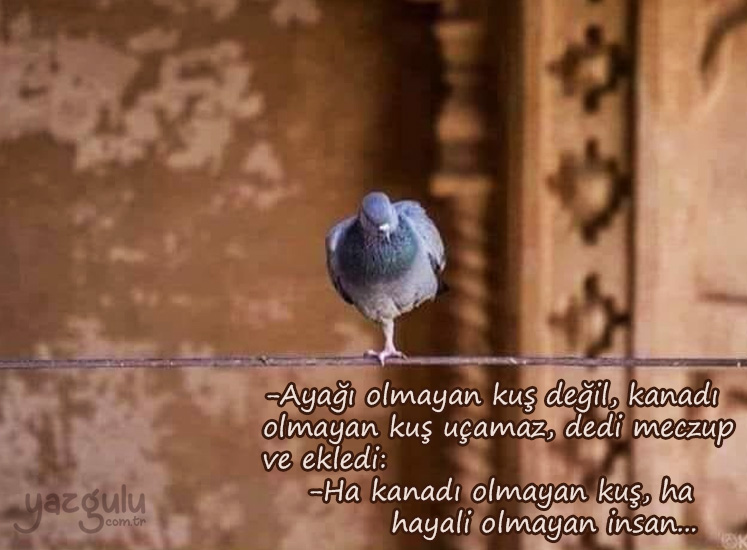 -Ayağı olmayan kuş değil, kanadı olmayan kuş uçamaz, dedi meczup ve ekledi: -Ha kanadı olmayan kuş, ha hayali olmayan insan...