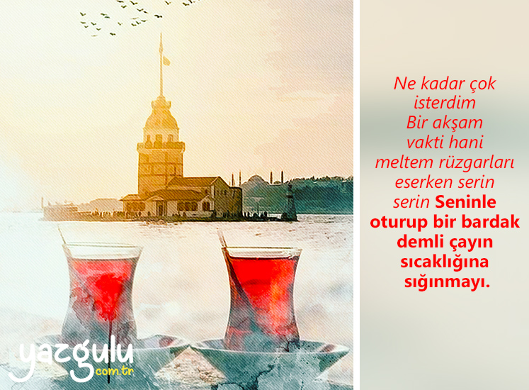 Ne kadar çok isterdim Bir akşam vakti hani meltem rüzgarları eserken serin serin Seninle oturup bir bardak demli çayın sıcaklığına sığınmayı.